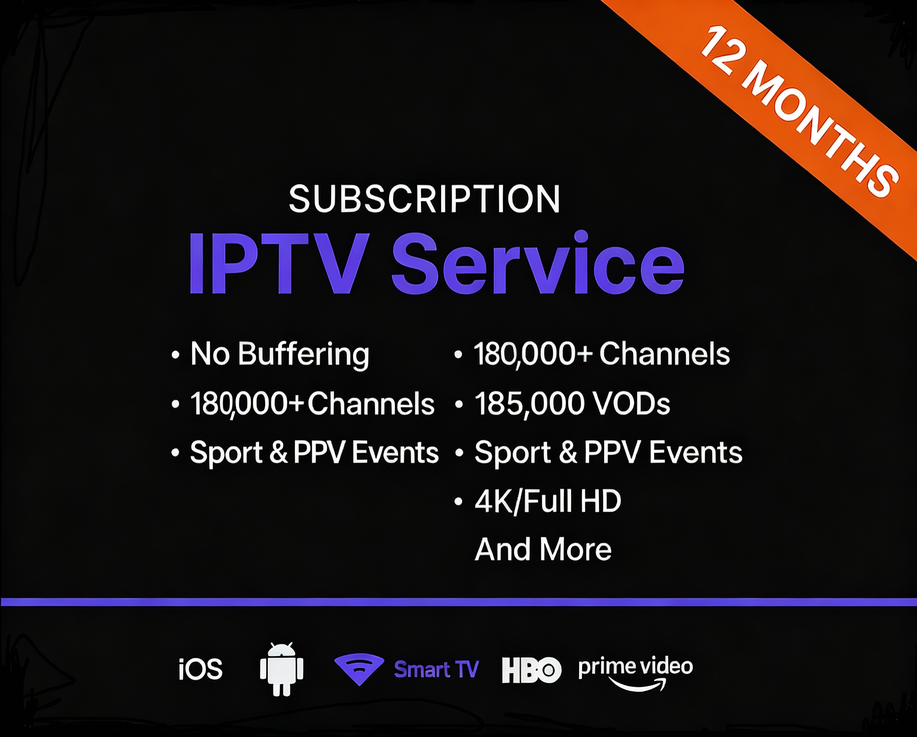 12 Months Subscription IPTV Premium Service 180.000 IPTV channels and more than 85000 movies and series with 4k FHD, IPTV quality 100% Stable.